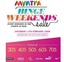Myntra , the online shopping hub is now showcasing an amazing offer where you get to enjoy buying Myntra Binge Weekends - Upto 70% OFF on Clothing, Footwear & Accessories. MORE